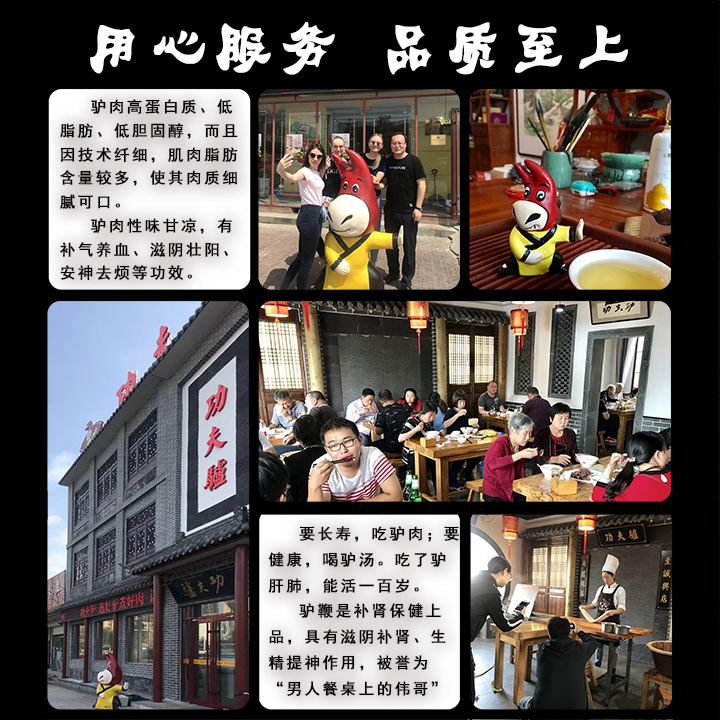 功夫驢始于1717年的萬貫驢肉火燒小店。幾百年的發展完善,從只為果腹的廉價“大火燒”到乾隆口中的“蛤蟆吞蜜”一直發展到如今擁有工業化流程,標準化操作的現代化股份公司。功夫驢視質量如生命,從驢源的選擇、火燒加工、出品的時間,都設置了規范流程,確保了品質的安全和統一。現在的功夫驢已從單純的驢肉火燒制作演變成擁有上百道驢肉精品菜系,驢肉火鍋、驢肉鍋仔、驢肉炒菜、驢肉水餃、驢肉餛飩、驢肉熏腸等系列驢產品的綜合性連鎖企業。