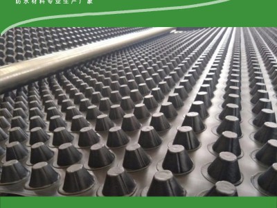 塑料排水板是由聚乙烯(HDPE)為原料,塑膠底板經過沖壓制成圓錐突臺而成。圓錐突臺的頂面鋪設一層過濾土工布,以阻止泥土微粒通過,從而避免排水通道阻塞使通道排水順暢。 傳統的排水方式使用磚石瓦塊作為導濾層、使用較多的鵝卵石或碎石作為濾水層、將水排到指定地點。而用排水板取代鵝卵石濾水層來排水則省時、省力又節能、節省投資、還能降低建筑物的荷載。良好的排水系統對土建的施工周期及構筑物的正常使用和壽命具有重要的作用。排水板與多孔滲水管組成一個有效的疏排水系統,圓柱形的排水板與土工布也組成一個排水系統,從而形成一個具有滲水、貯水和排水功能的系統。